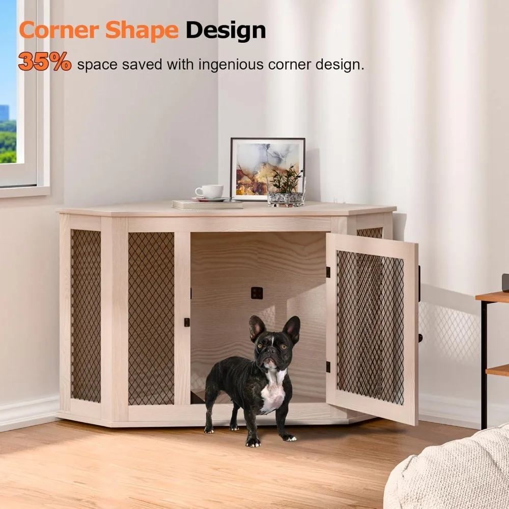 This dog crate furniture is designed to save space with its corner configuration, which can free up to 35% more room compared to traditional square crates. It's an ideal choice for rooms with limited space, as it fits neatly into any corner, providing a dedicated area for your dog. The crate also functions as a stylish piece of furniture, suitable to use as a coffee table, end table, or TV stand. Its sturdy top can support up to 180 lbs, offering ample space for storage and display of items like photo frames, plants, or decorative pieces. Made from premium wood, this dog crate ensures durability and longevity. The well-ventilated design promotes air circulation for your dog's comfort, and the metal door lock adds an extra layer of security to prevent your dog from escaping. It's a secure and cozy space for your dog that will last for years. Sized at 52"L x 27.6"W x 29.1"H, this crate is suitable for medium to large dogs up to 80 pounds. When measuring your dog, remember to add 4" to the length for better mobility and comfort within the crate. Assembly is a breeze with this product. The package includes instructions and an accessory bag, with each part pre-numbered and pre-drilled, allowing for easy assembly in about 30 minutes. Your dog can start enjoying their new space right away.